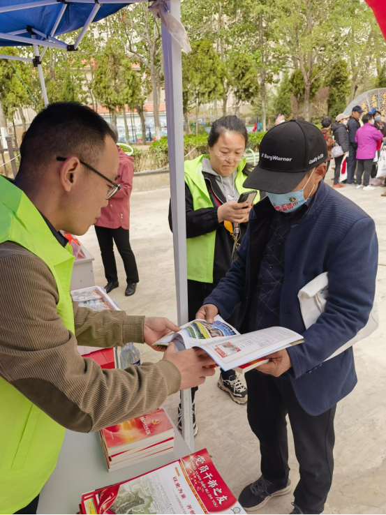 智能汽车工程系党总支结合“党建知识送学上门”的双报到服务项目,为居民提供二十大文件汇编宣传册以及党建方面的杂志,党员们还进行生动的讲解“你们看,党的二十大报告通篇体现了以人民为中心的发展思想,体现了人民至上,是一份饱含为民、亲民、爱民之情的好报告!”来往的居民不时地驻足聆听,并热烈讨论。